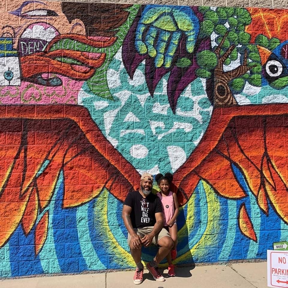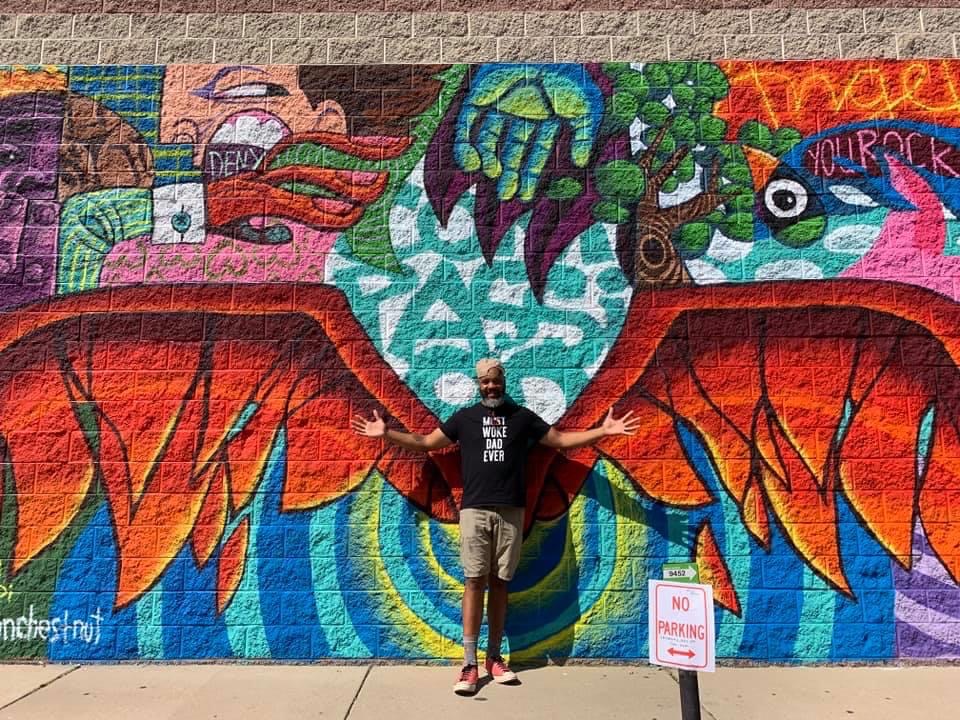 Cbabi Bayoc was tapped by The Repertory Theatre of St. Louis to create the mural to go along with its debut of the play ‘Angels in America’. The two-part play by Tony Kushner won several awards when it debuted in the early 1990s, including the Pulitzer Prize for Drama and the Tony Award for Best Play.