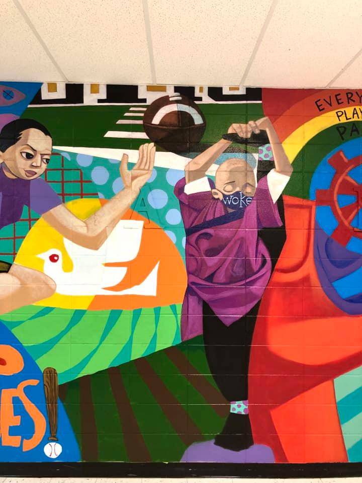 Lebanon High School Art Teacher Elizabeth Barker eceived a grant from the Missouri Arts Council to have St. Louis artist Cbabi Bayoc paint a mural with the assistance of students.