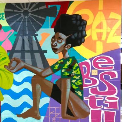 Bayoc is working on a wall-size painting at the high school “to empower kids and give them a sense of self,” art teacher Eric Adams said.
